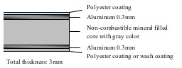 ALPOLIC™/fr LT is composed of a non-combustible mineral core with a small amount of low-density polyethylene sandwiched between two skins of 0.3 mm thick aluminum. The core, indispensable for fire safety of interior application, is gray in color, with a touch of carbon black for an aesthetically pleasing cut edge.